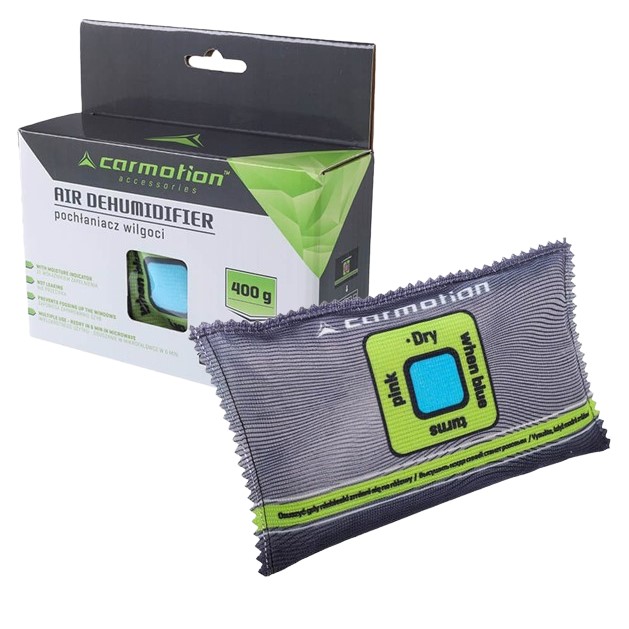 Pohlcovač vlhkosti Carmotion absorbuje přebytečnou vlhkost z interiéru našeho vozu a následně ji bezpečně uloží uvnitř. Absorpcí vlhkosti z interiéru vozu zvyšuje výrobek svoji hmotnost, tento proces probíhá bez rizika vytečení nebo skvrn. Snížením úrovně vlhkosti absorbér pomáhá snižovat zamlžování oken.
