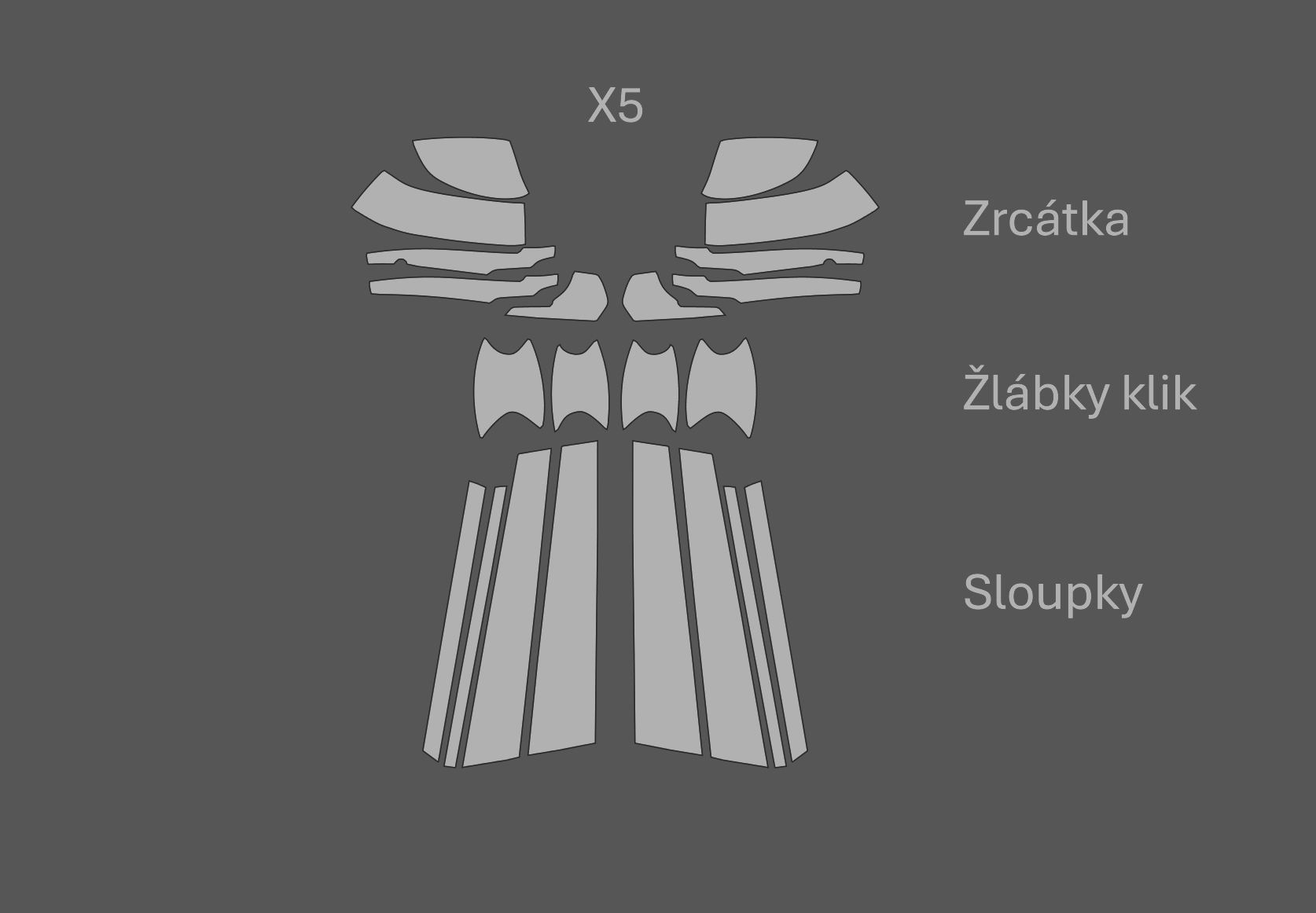 - JEM PPF předřezaná fólie zrcátka, žlábky klik a sloupky BMW X5 Černý lesk
