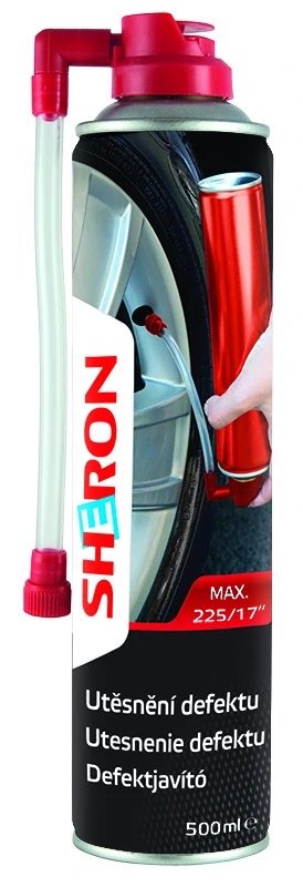 SHERON Utěsnění defektu je na bázi kaučuku a představuje snadné a rychlé opravení defektu nastříkáním obsahu přípravku do pneumatiky. Je vhodný pro všechny typy bezdušových pneumatik až do rozměru 225/17“. Demontáž pneumatiky není nutná.
